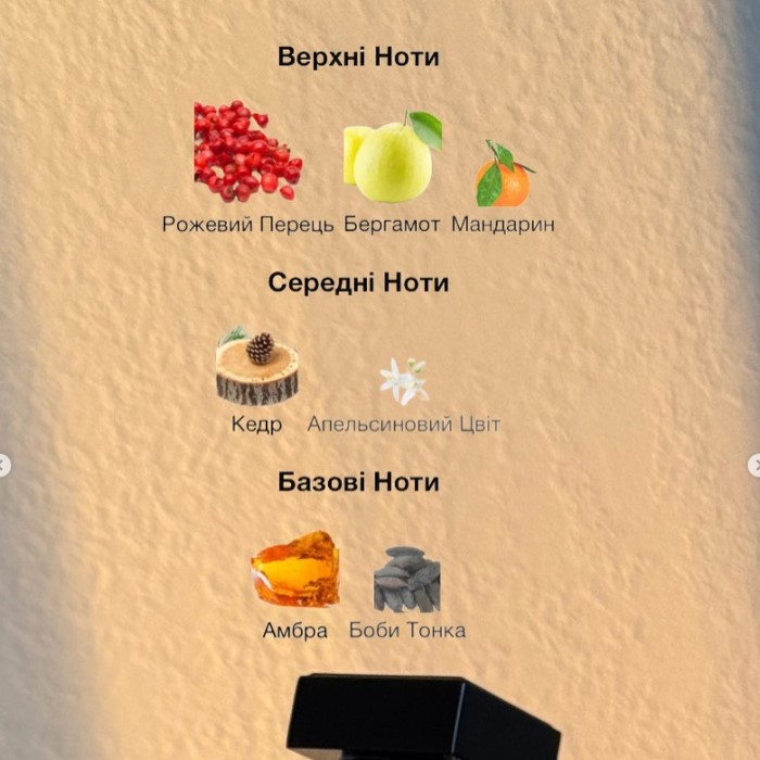 До цитрусів додається легка перчинка, а далі аромат стає теплим і м’яким, схожим на чисту теплу шкіру після душу з деревним гелем.