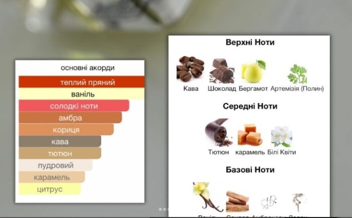 Це густа ваніль із карамельною ніжністю, змішана з нотами тют*ну та легким алкогольн*м акцентом. У результаті аромат нагадує солодкий лікер із тютюновим димком: водночас теплий, затишний і трохи зухвалий.