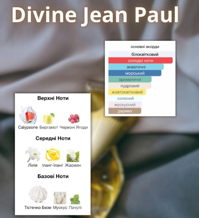Jean Paul Gaultier Divine пахне як свіжий морський бриз із відтінком солодких ягід, ніжних квітів та повітряної меренги. Легка сіль, лілія та ванільна солодкість роблять його водночас літнім, жіночним і гурманським. Багато хто порівнює з відчуттям пляжу, сонця та солодкого десерту.