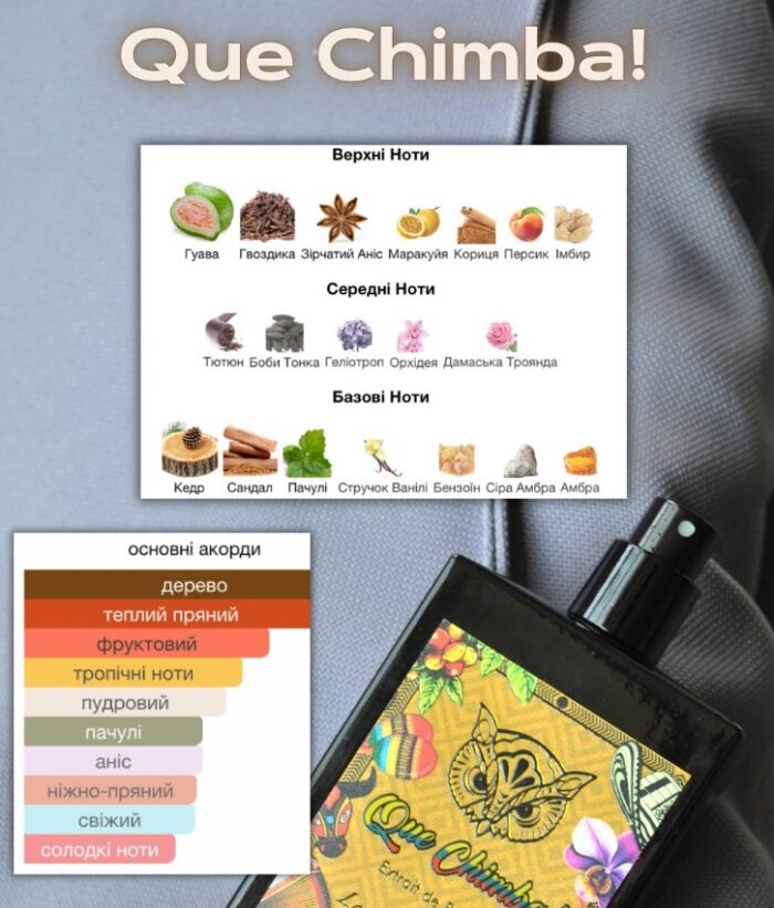 Que Chimba! пахне так, ніби ви потрапили на гучну вечірку в тропіках, а стіл заставлений фруктами : персики, маракуйя, гуава, а в келиху солодкий лікер з корицею та гвоздикою.
