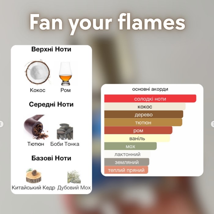 Назва аромату говорить сама за себе. Розпали в собі вогонь: дорогий якісний тют*н, який вимочили в сиропі з кокосу і додали туди трохи міцного рому. І це все трохи підкоптили.