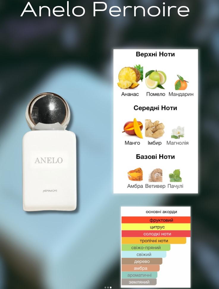 Anelo Pernoire пахне так, ніби ти відкушуєш соковитий шматок ананаса й манго просто під сонцем. Спершу він свіжий і яскравий, далі з’являється ніжність квітів та теплий відтінок спецій.